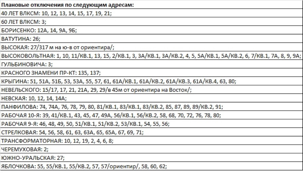 Время проведения плановых работ с 9:00 до 17:00. Длительность каждого отключения от двух до восьми часов.