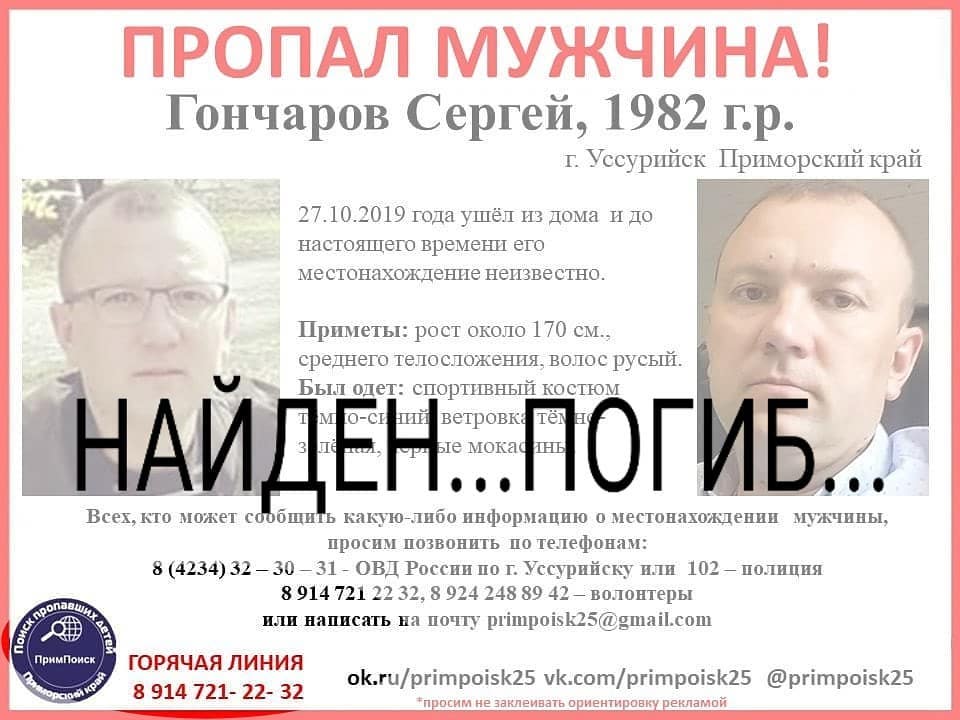 Пропавший 27 октября Сергей Г. найден погибшим в Приморье, сообщает РИА VladNews со ссылкой на Instagram-паблик «ПримПоиск».