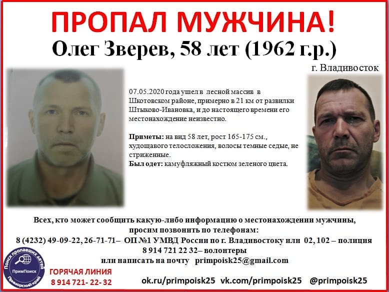 В Приморье 7 мая пропал Олег Зверев, 58 лет (1962 года рождения). Он ушел в лесной массив в Шкотовском районе, примерно в 21 км от развилки Штыково-Ивановка, и до настоящего времени его местонахождение неизвестно, сообщает РИА VladNews со ссылкой на "ПримПоиск".