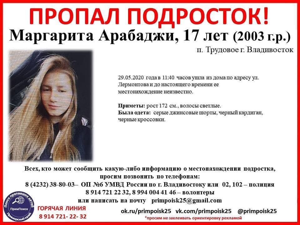 Маргарита Арабаджи, 17 лет (2003 года рождения) поселок Трудовое, город Владивосток. 29 мая 2020 года в 11:40 часов ушла из дома по адресу улица Лермонтова и до настоящего времени ее местонахождение неизвестно, сообщает РИА VladNews со ссылкой на "ПримПоиск".