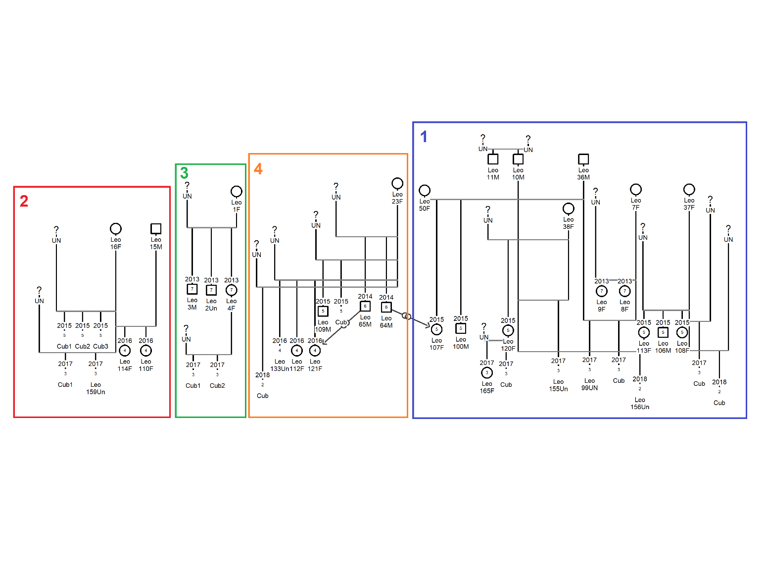 Учёные систематизировали данные об индивидуальных родственных связях в популяции дальневосточного леопарда. Смоделировать генеалогическое древо удалось для 47 особей. Дальнейший анализ «семейной хроники» показал, что древо разветвляется на четыре отдельных линии, самая большая из которых включила сразу три поколения леопардов.