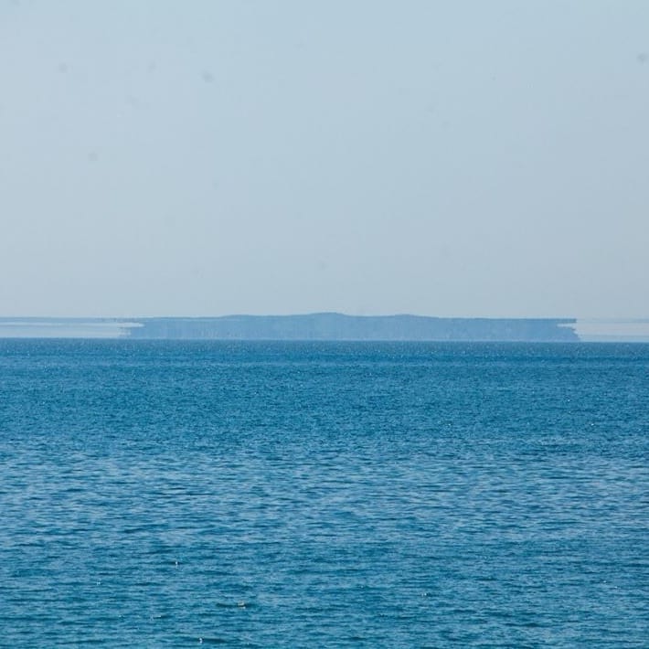 «На снимках с кораблем видно даже двойное отражение. И остров Фуругельм на одном снимке в обычном состоянии, а на остальных уже с миражом. Голубая полоса в небе - отражение моря», - рассказывает очевидец.