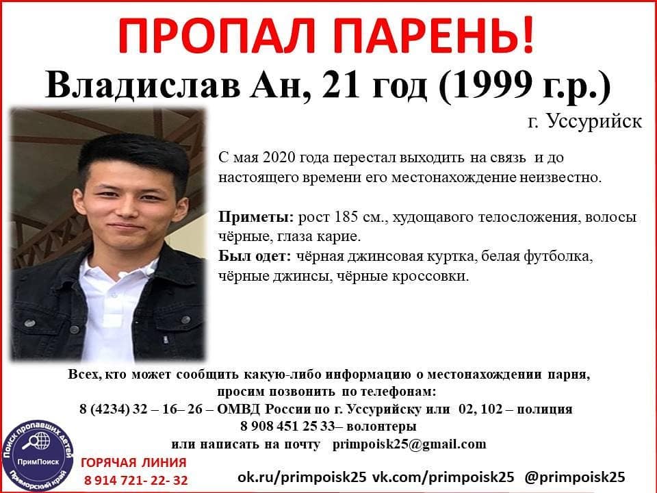 Владислав Ан, 21 год, 1999 года рождения, живет в Уссурийске. С мая 2020 года перестал выходить на связь и до настоящего времени его местонахождение неизвестно, сообщает РИА VladNews со ссылкой на "ПримПоиск".