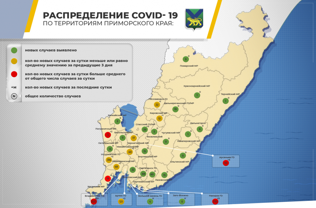 Всего с начала эпидемии во Владивостоке было зарегистрировано 2137 заболевших, в Находке – 770, Уссурийске – 316, в Арсеньеве – 95.