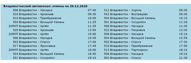 Более 25 междугородних рейсов из Владивостока отменены 20 декабря, сообщает РИА VladNews со ссылкой на Примвокзал.