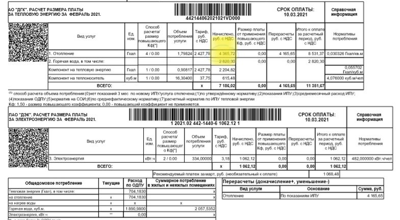 В феврале жителям был сделан перерасчет с учетом фактического потребления домом тепловой энергии в предыдущем месяце, а также начисления за февраль.