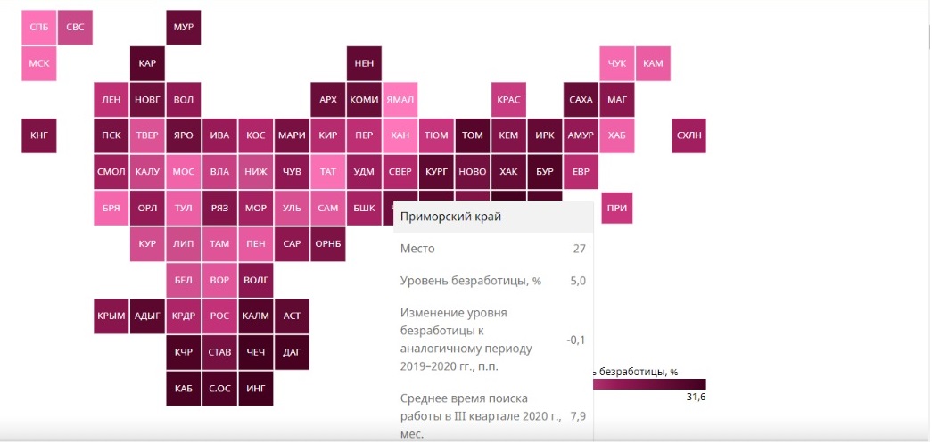 Уровень безработицы в крае составил 5%. Поиск работы в среднем занимает у приморцев восемь месяцев. Из 85 регионов Приморье заняло 27 позицию. Исследование опубликовали на сайте РИА Рейтинг, сообщает РИА VladNews.