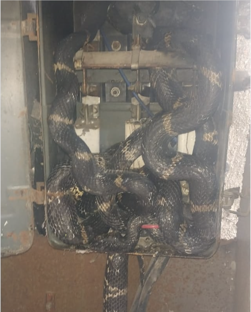 Электрики, открыв электрический щиток на скважине увидели там целый клубок змей, которые скорее всего пригрелись внутри щитка.