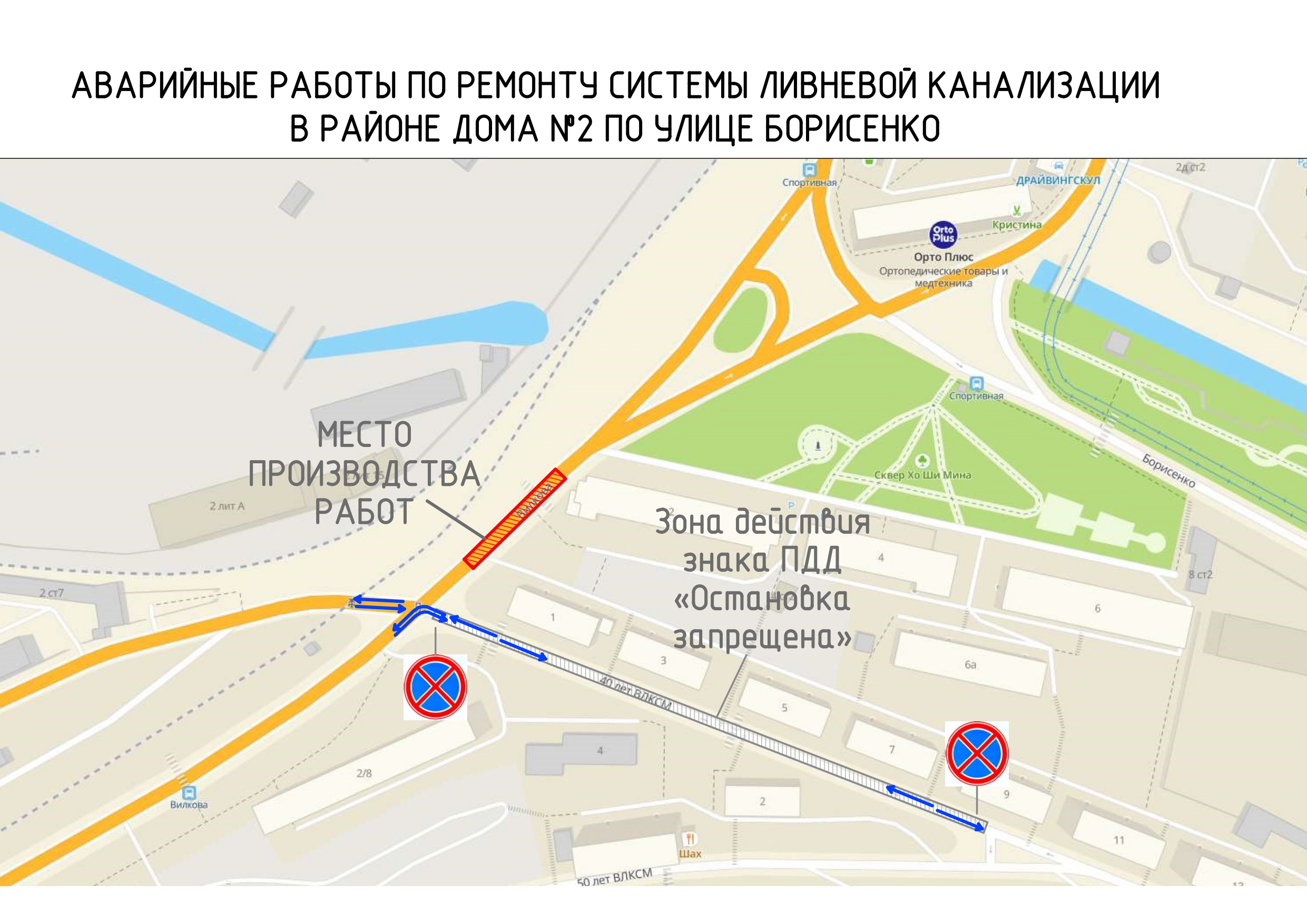 Ограничение движения автотранспорта в районе дома № 2 на улице Борисенко будет введено сегодня с 22 часов. Это связано с началом ремонта разрушенного ливневого коллектора.