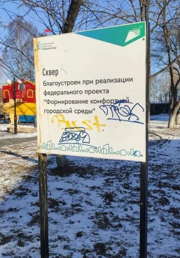 На фото – лавочки без спинок, разбитые уличные фонари, множество надписей и граффити на детской площадке, а также исписанная табличка на входе в сквер.