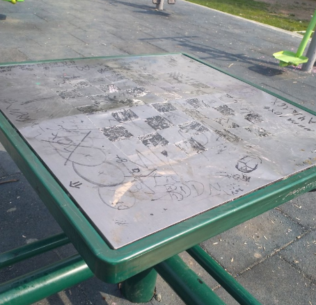 Частыми гостями здесь стали местные вандалы, которые регулярно приводили площадку в негодность, а также сломали несколько объектов. Хулиганы исписали маркером шахматный стол, разобрали лавочку для отдыха, поломали урну.