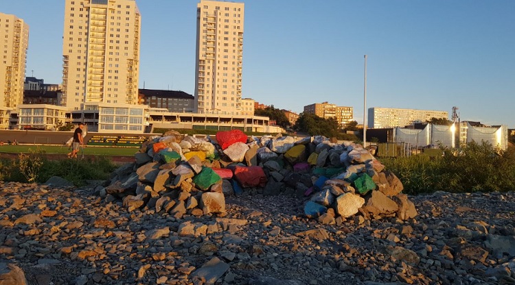 На первый взгляд новый арт-объект напоминает кучу камней. Однако, если подойти к нему с другой стороны, то можно разглядеть своеобразную скамейку.