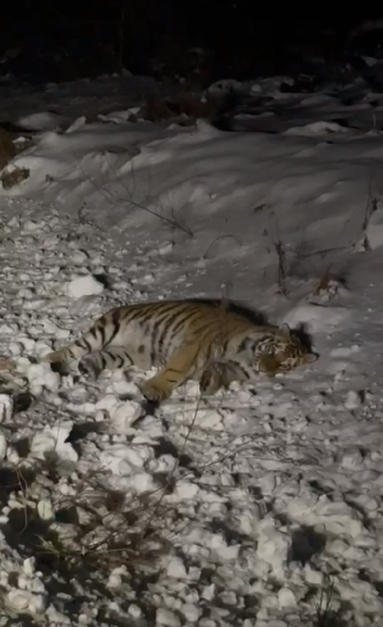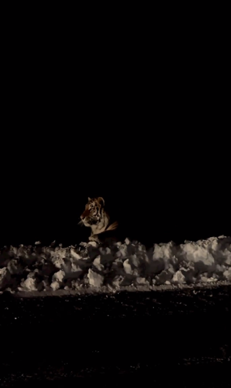 Тигр пропустил авто, перешел дорогу, а затем снова улегся там, где было поменьше снега, и принялся позировать.