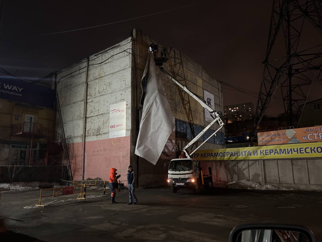 Кроме этого бригады убирают незаконно установленные рекламные конструкции. За минувшую ночь работники убрали 12 таких объектов на ул. Снеговой, Деревенской и Посадской.
