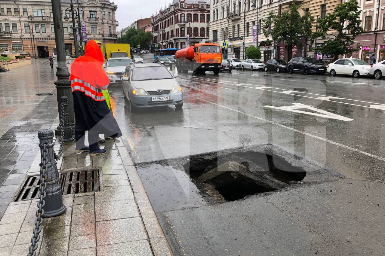 В центре Владивостока провалилась ливневка. Проблему ликвидируют только ночью, чтобы не создавать пробок на загруженной дороге. Водителей просят быть внимательными: