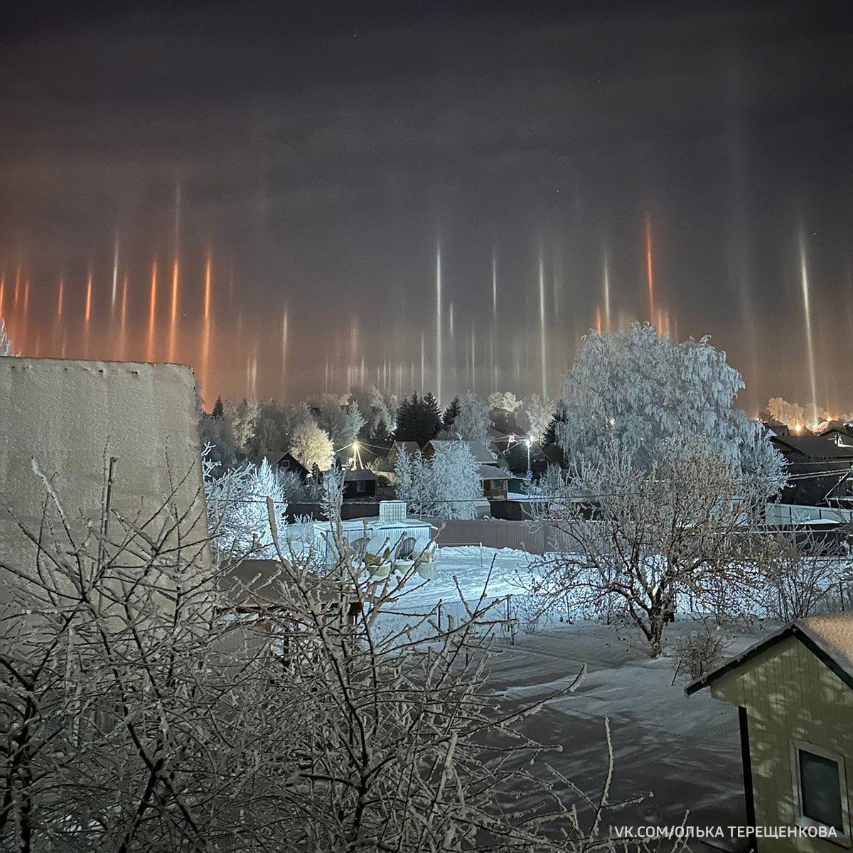 «Это атмосферное чудо происходит при низких температурах и высокой влажности, когда в воздухе формируются плоские кристаллы льда, — объяснили специалисты. — Световые столбы появляются от ярких источников света и создают впечатление, будто «висят» в воздухе, хотя физически они не соединены с источниками света».
