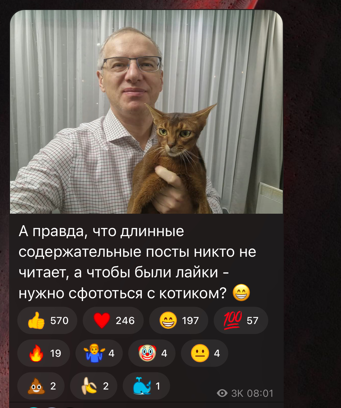 «А правда, что длинные содержательные посты никто не читает, а чтобы были лайки, - нужно сфототься с котиком?».