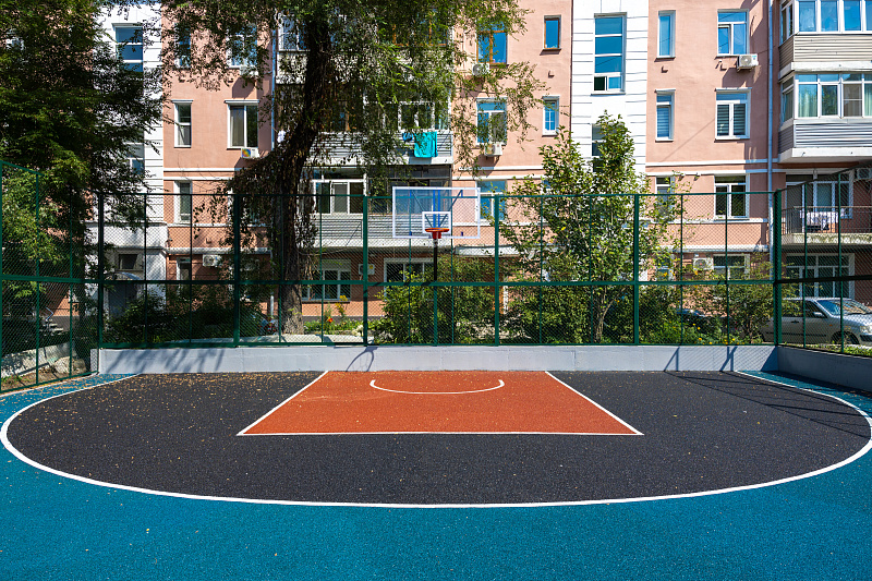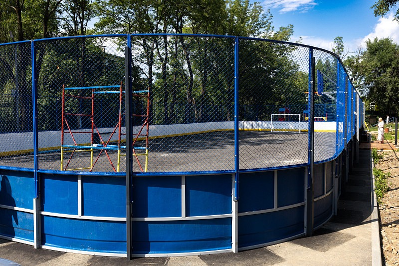 На Хабаровской, 7 основные строительные этапы завершены. Подрядчики ожидают доставку резинового покрытия — после его укладки местные жители смогут играть в баскетбол и футбол.