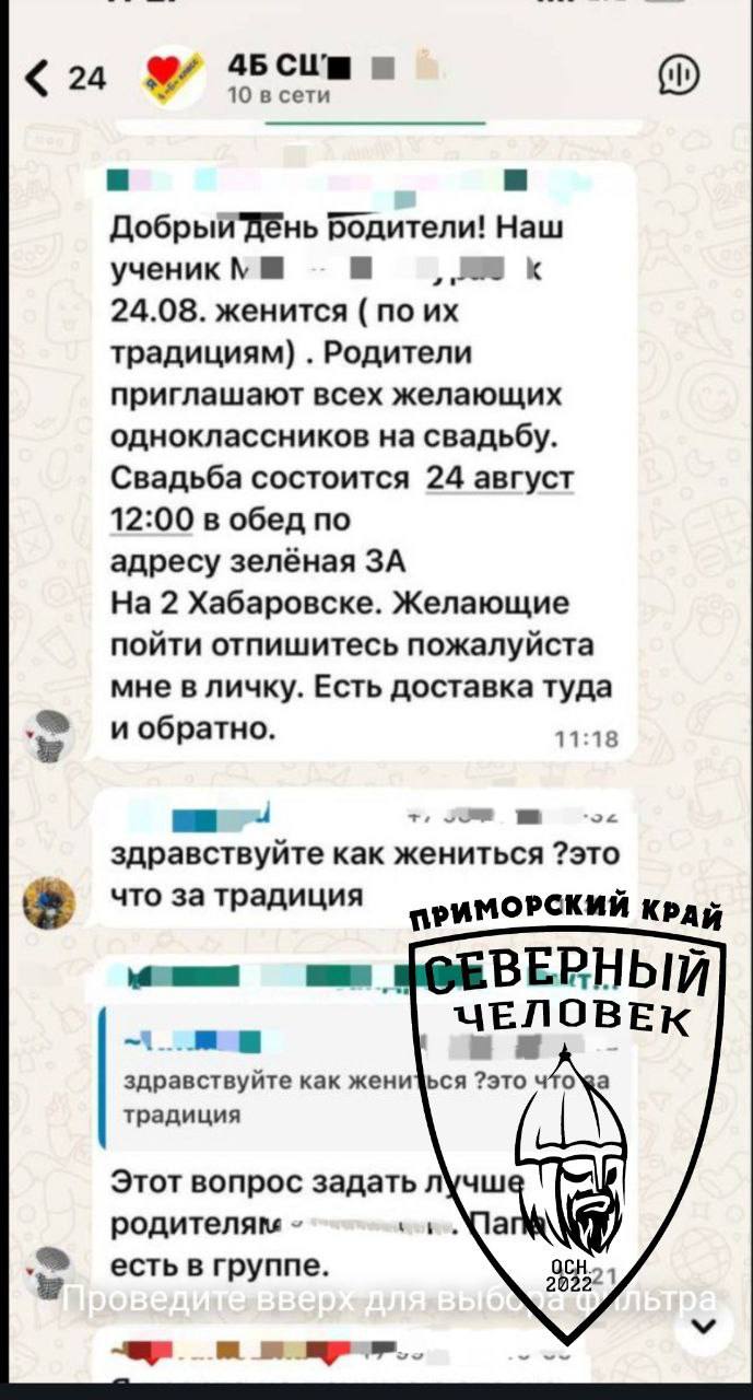 По данным Telegram-канала «Северный человек Владивосток», в сообщении педагог указала, что событие пройдёт в соответствии с «их традициями». Родители были шокированы приглашением и не знали, как объяснить детям, почему их сверстник вступает в брак. На уточняющие вопросы преподаватель сослалась на «обычаи», а затем переадресовала их отцу ребёнка.