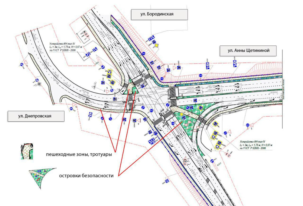 Основные работы на перекрёстке начнутся в 2026 году, а подготовительные мероприятия стартуют уже осенью. По новому проекту изменится геометрия проезжей части: появится дополнительная полоса при выезде с улицы Анны Щетининой на Бородинскую. Для поворачивающих с Выселковой на Анны Щетининую выделят крайнюю правую полосу, а съезд на поворотную полосу будет организован до светофора. Для пешеходов обустроят тротуары, наземные переходы и два островка безопасности на пересечении улиц Анны Щетининой, Днепровской и Бородинской. Также появятся новые дорожные знаки и разделительные полосы между встречными потоками.