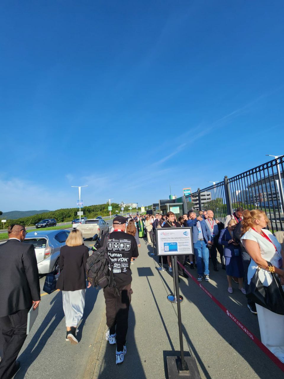 Возле кампуса ДВФУ уже собрались огромные очереди из организаторов, волонтеров и представителей СМИ. Все они ожидают, когда их пропустят на территорию мероприятия.