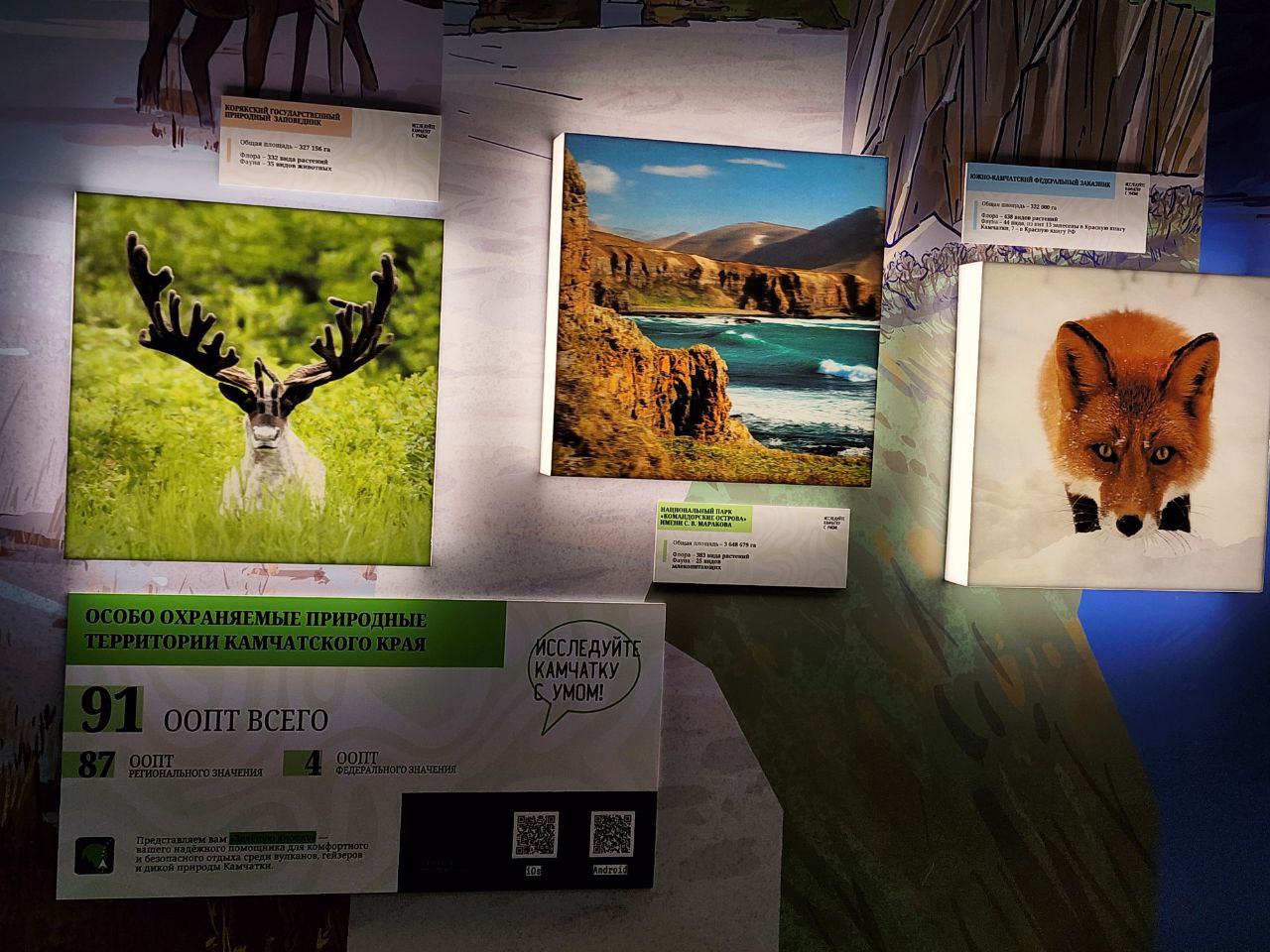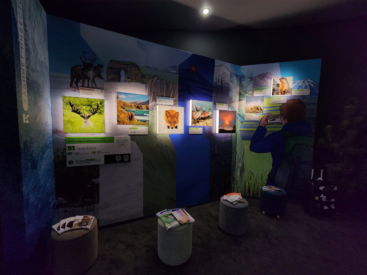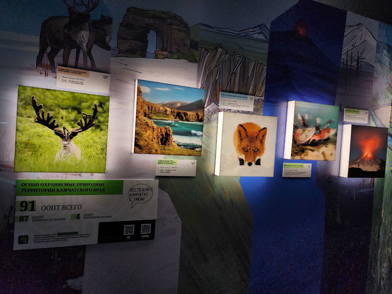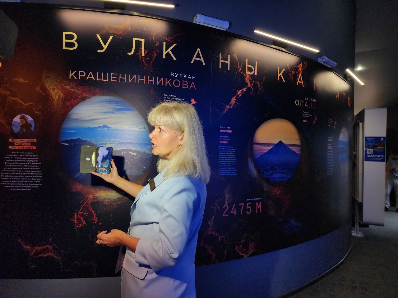 «На сегодняшний день Камчатка очень славится вулканами. Их порядка трёхсот, и тридцать из них относятся к действующим. Здесь, в этой зоне, любой человек может подойти, выбрать любую интересующую локацию и посмотреть, как это выглядит, если бы вы оказались в вулкане в какое-то определённое место или время. То есть, если вы планируете к нам приехать, вы можете прийти, восхититься и потом уже вживую увидеть все те локации, которые здесь представлены», - подчеркнула заместитель директора Камчатского выставочно-туристического центра, кандидат географических наук Наталья Темошева.