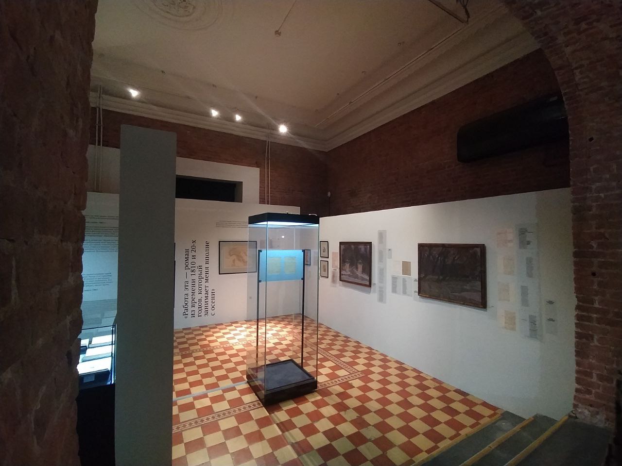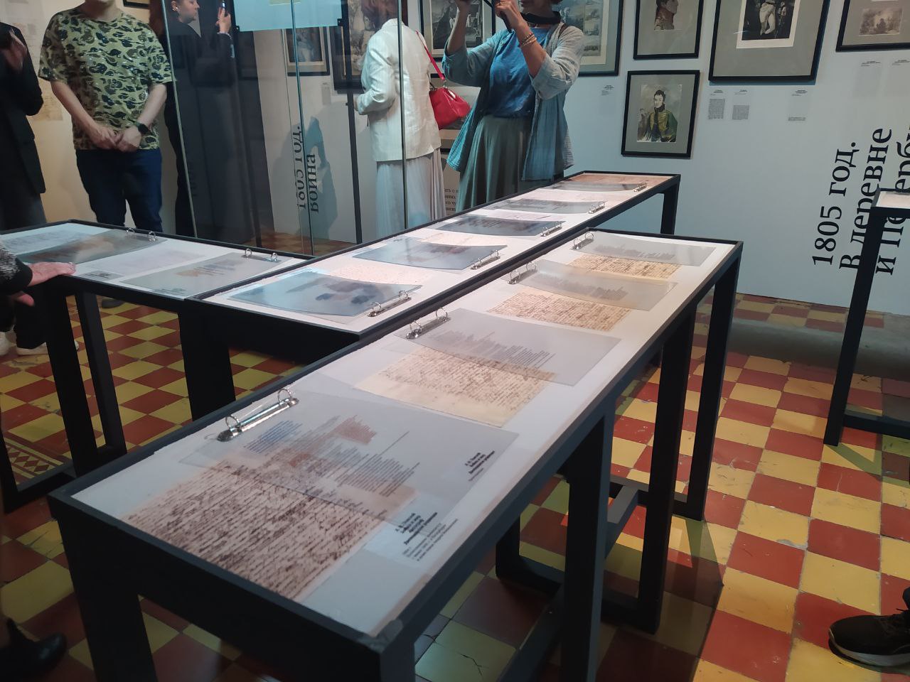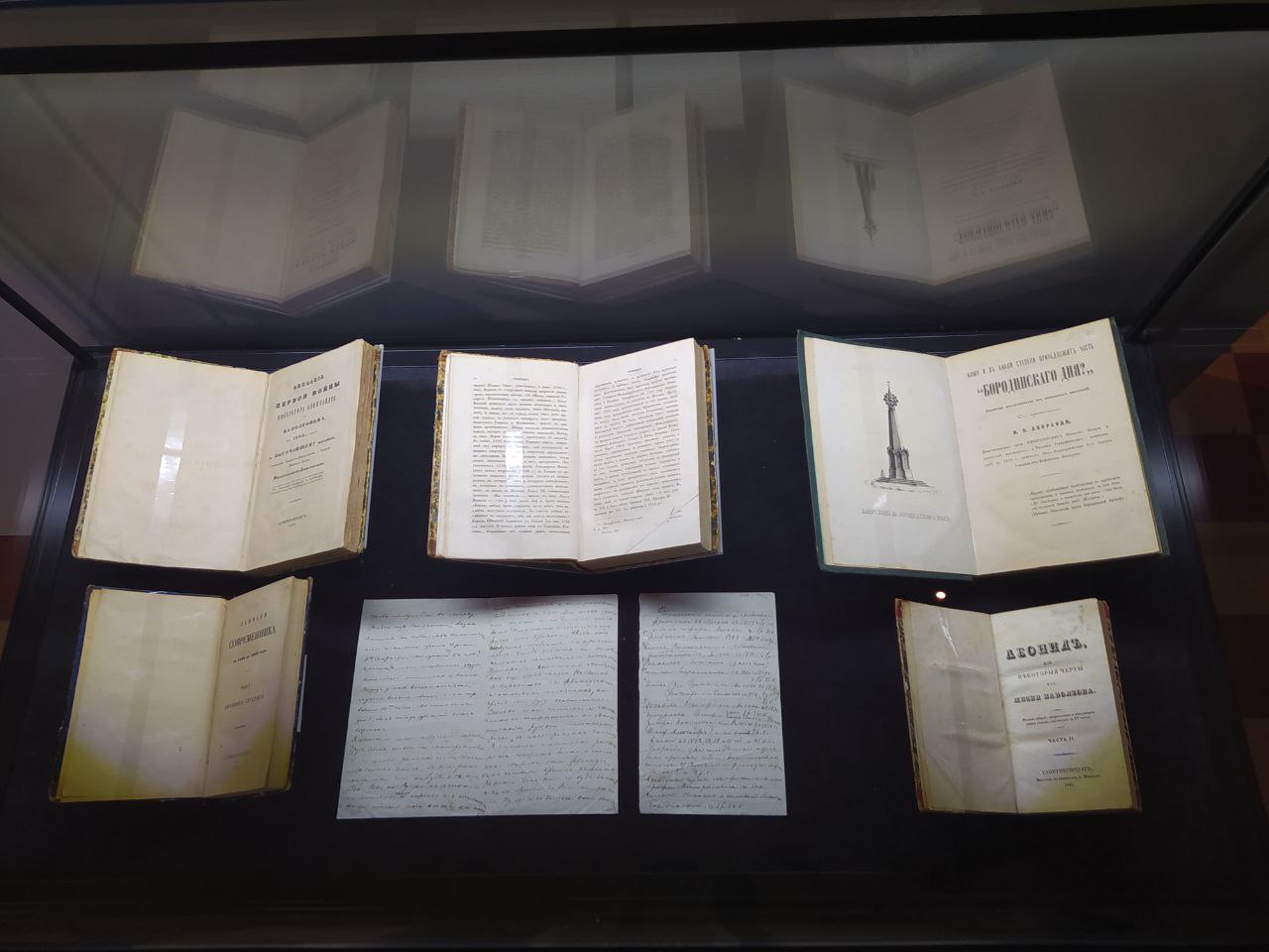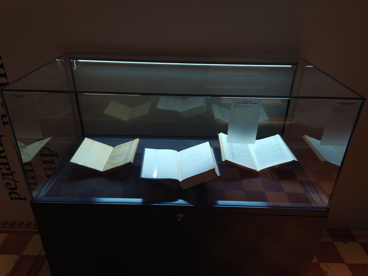 За стеклянными витринами хранятся первые подлинные издания книг «Война и мир», в том числе редкие экземпляры.