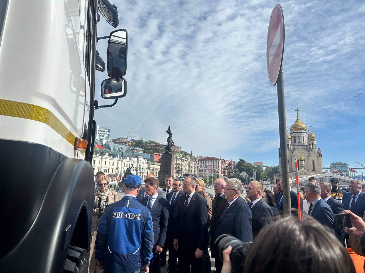 Сегодня делегации осматривают выставку белорусской спецтехники. На верхней площадке площади выстроились грузовики, коммунальная и дорожная техника, часть которой уже используется на приморских дорогах и в хозяйстве края.