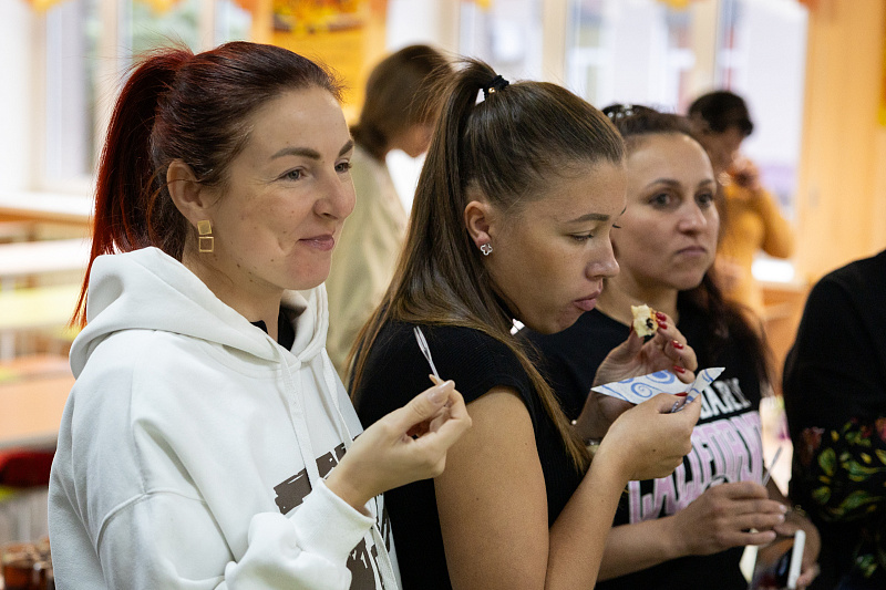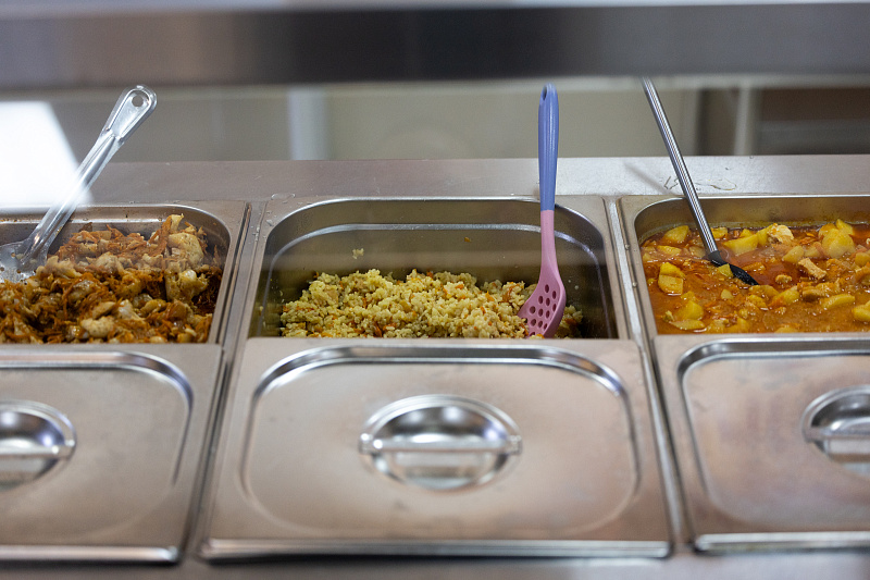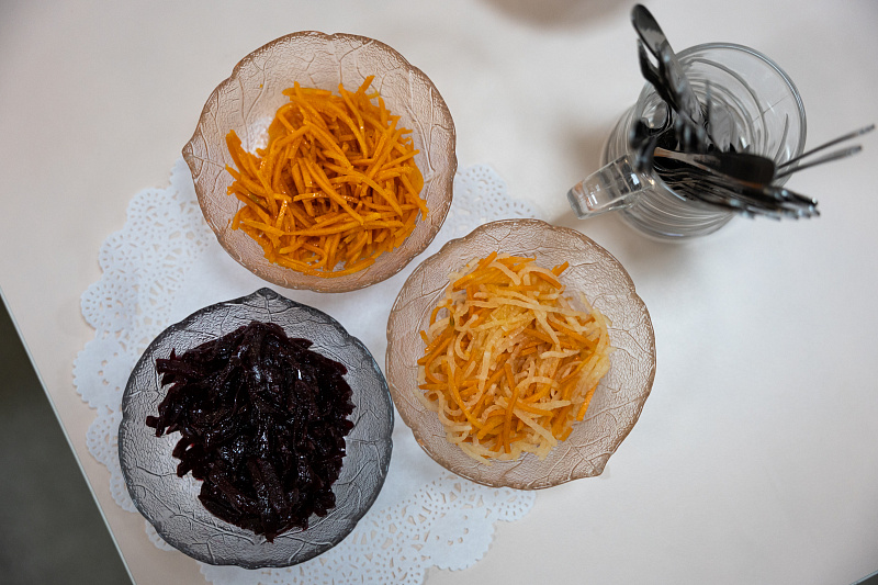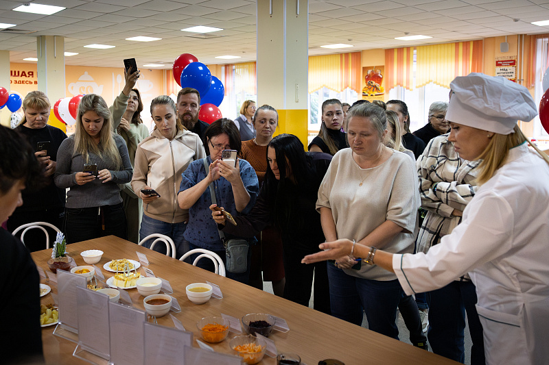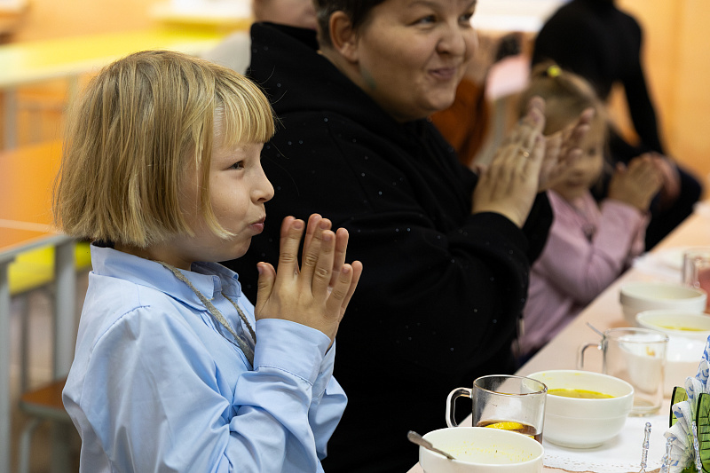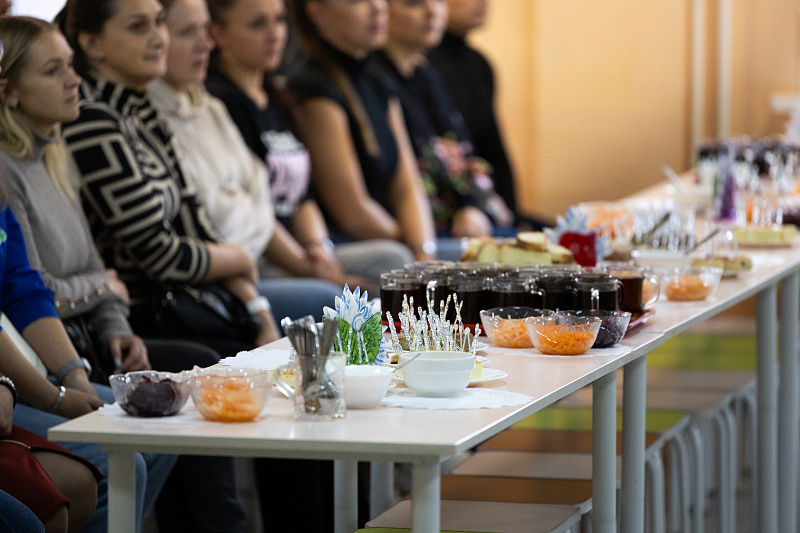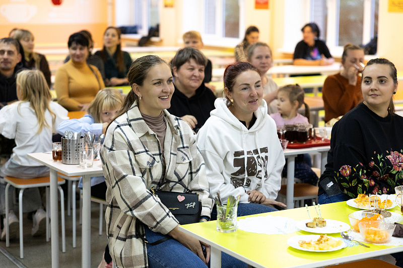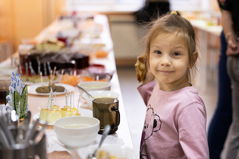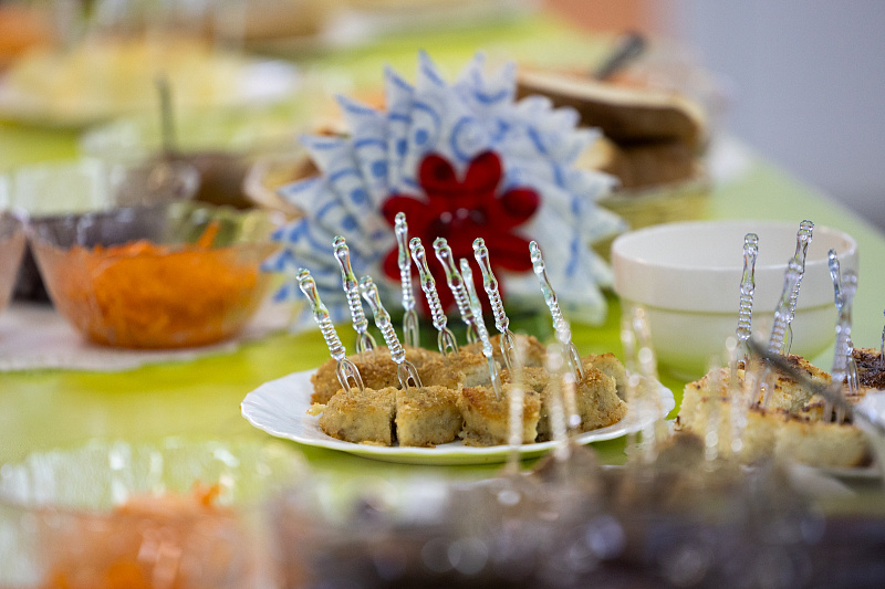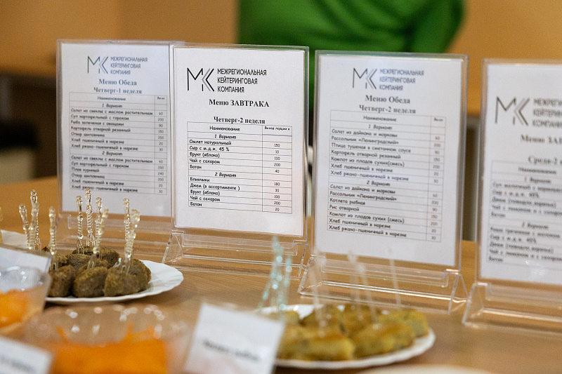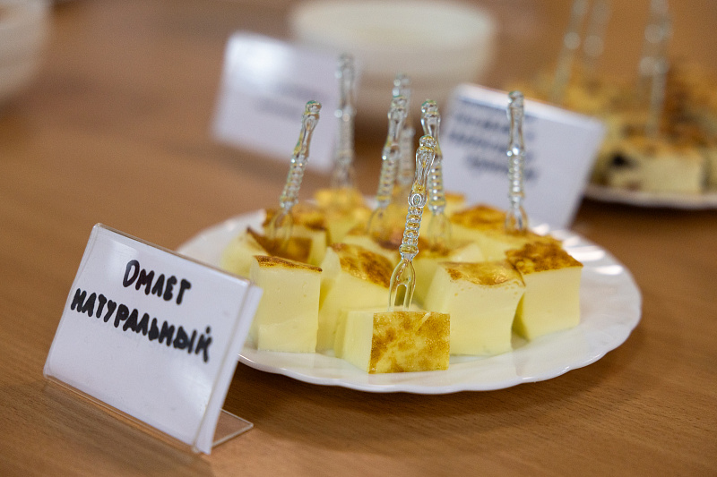 Гостям представили широкий ассортимент блюд, которые регулярно подаются детям. В меню дегустации вошли рыбные и мясные котлеты, сырная запеканка, омлет, различные овощные салаты, супы и свежая выпечка.