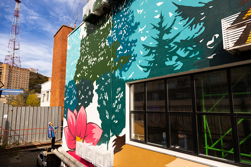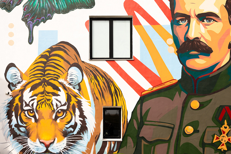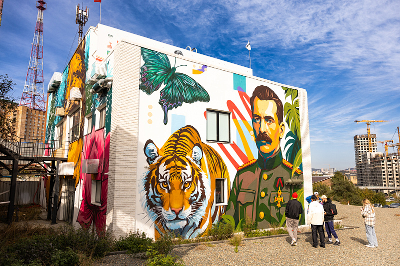 Преобразился и фасад штаба «Молодежь Приморья» на Аксаковской. К юбилею исследователя Владимира Арсеньева на здании появился его портрет в окружении уникальной флоры и фауны края: здесь и крупные кошки, и лисица с острова Русский, и бабочка махаон Маака, и знаменитые приморские кедры с лотосами. Цветовая гамма работы полностью соответствует фирменному стилю Росмолодёжи, выступившей заказчиком проекта.