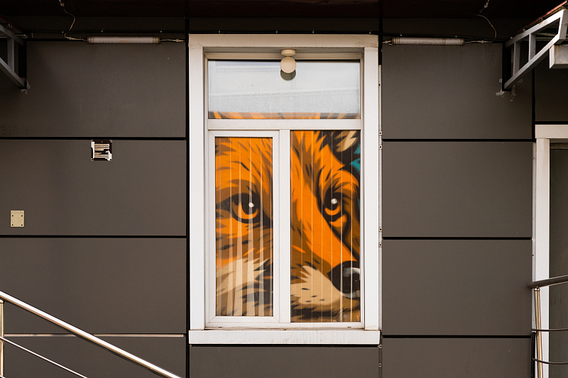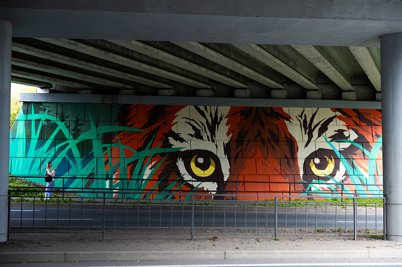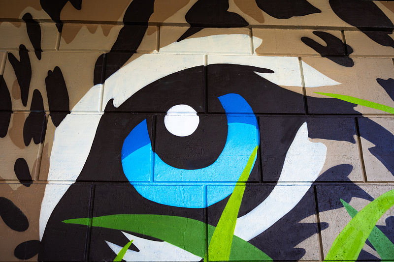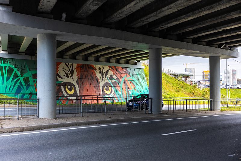 Еще одна конкурсная работа расположена под надземным переходом на улице Олега Кошевого. Здесь друг на друга смотрят хозяева дальневосточной тайги — амурский тигр и дальневосточный леопард. Художникам удалось мастерски передать напряженную статику и выразительность взглядов хищников.