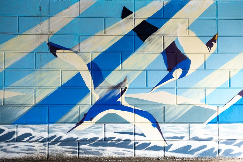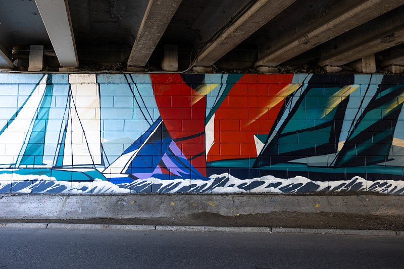 Один из масштабных рисунков украсил стену под мостом «Дружбы Тояма – Приморье». Художники изобразили яркие парусники, устремляющиеся в морскую даль, и стаи белокрылых чаек — классические символы Владивостока.