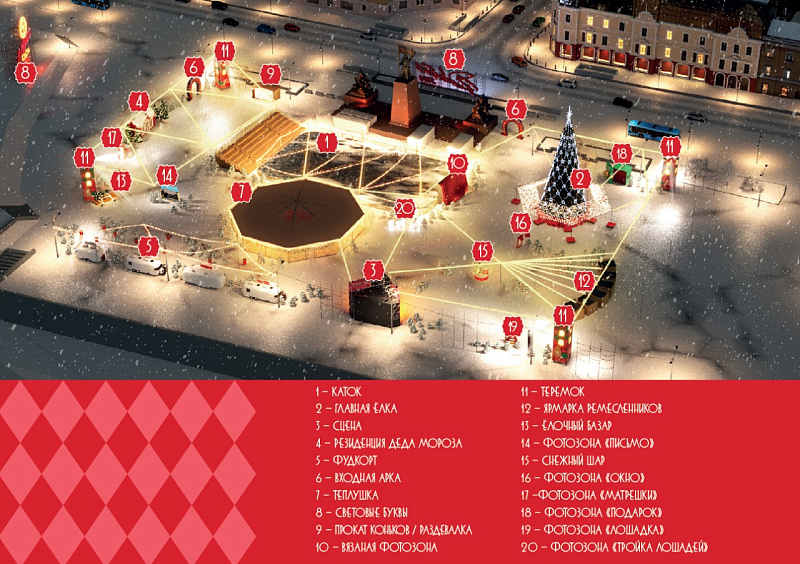 В центре внимания будет установлена 20-метровая елка, окруженная разнообразными фотозонами, включая уникальную вязаную локацию. Также будут работать каток с уютной теплушкой, ярмарка ремесленников, фудкорт и резиденция Деда Мороза, где каждый желающий сможет оставить свое письмо с пожеланиями.