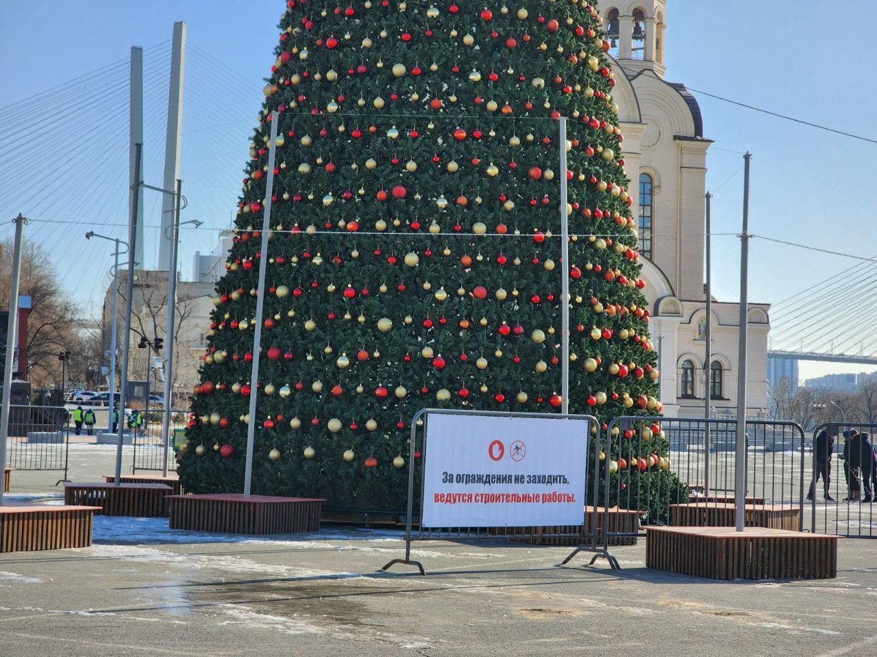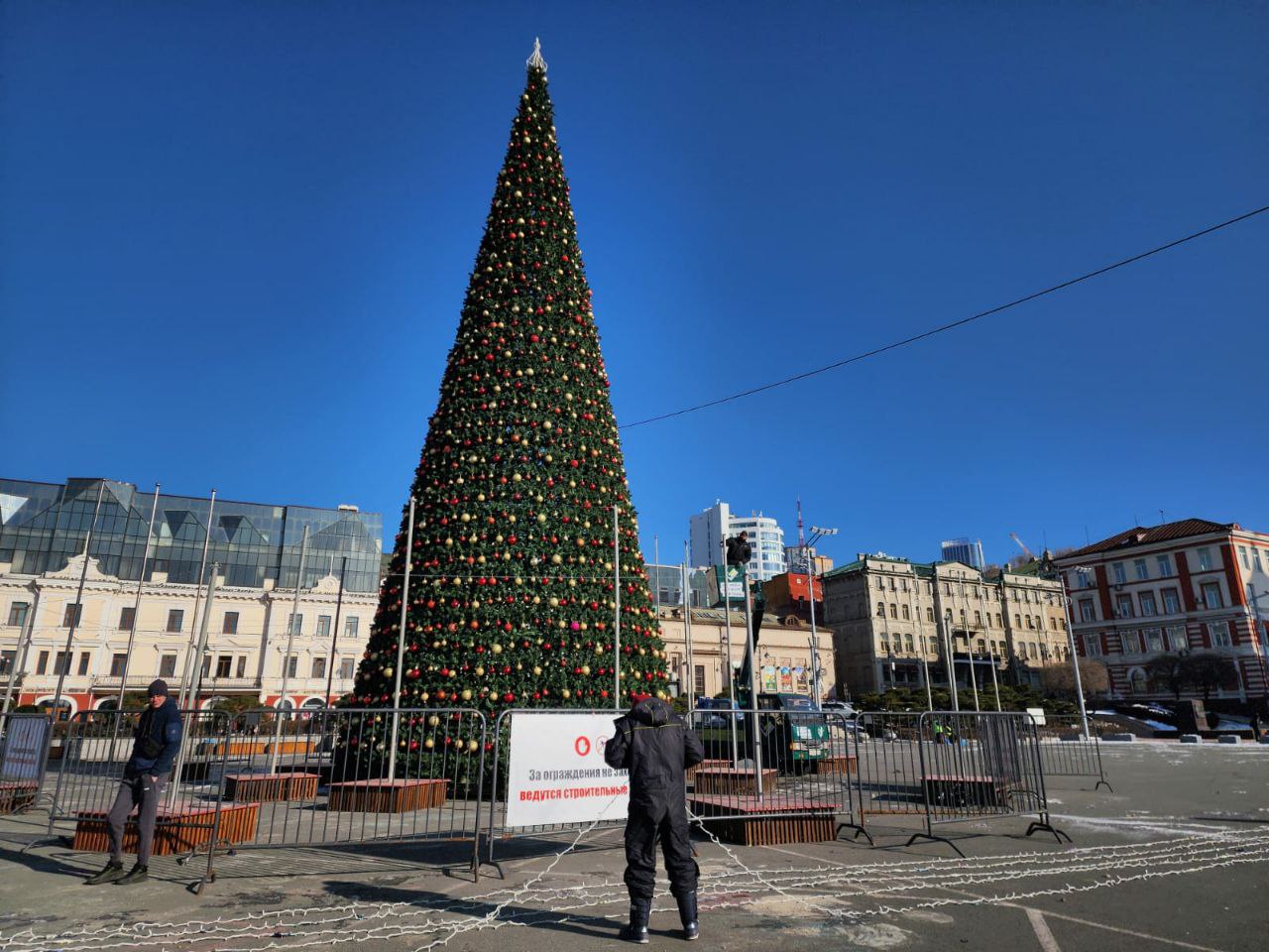 Корреспондент РИА VladNews разведал обстановку на центральной площади Владивостока. Здесь уже поставили елку, сейчас ее украшают к празднику.