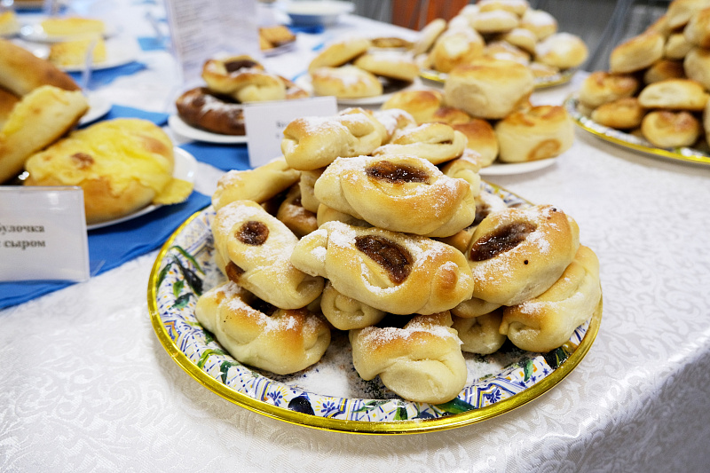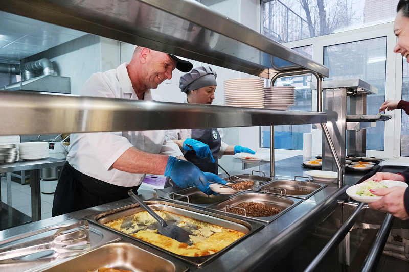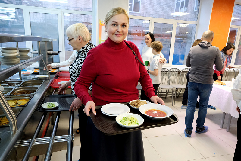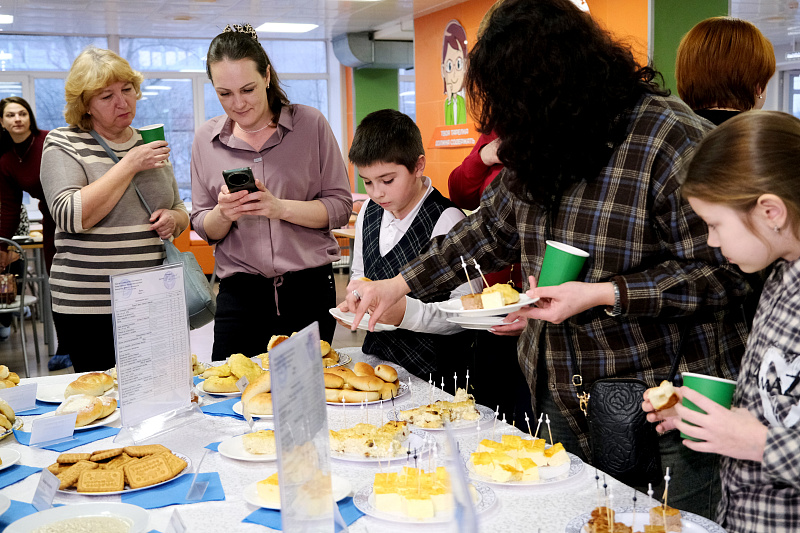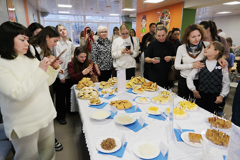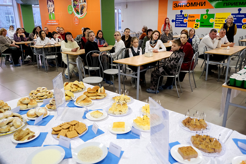 Гостям предложили оценить широкий ассортимент школьной столовой: мясные и рыбные котлеты, ленивые голубцы, омлет, творожную запеканку, витаминные салаты, гарниры, молочные каши, свежую выпечку и напитки.