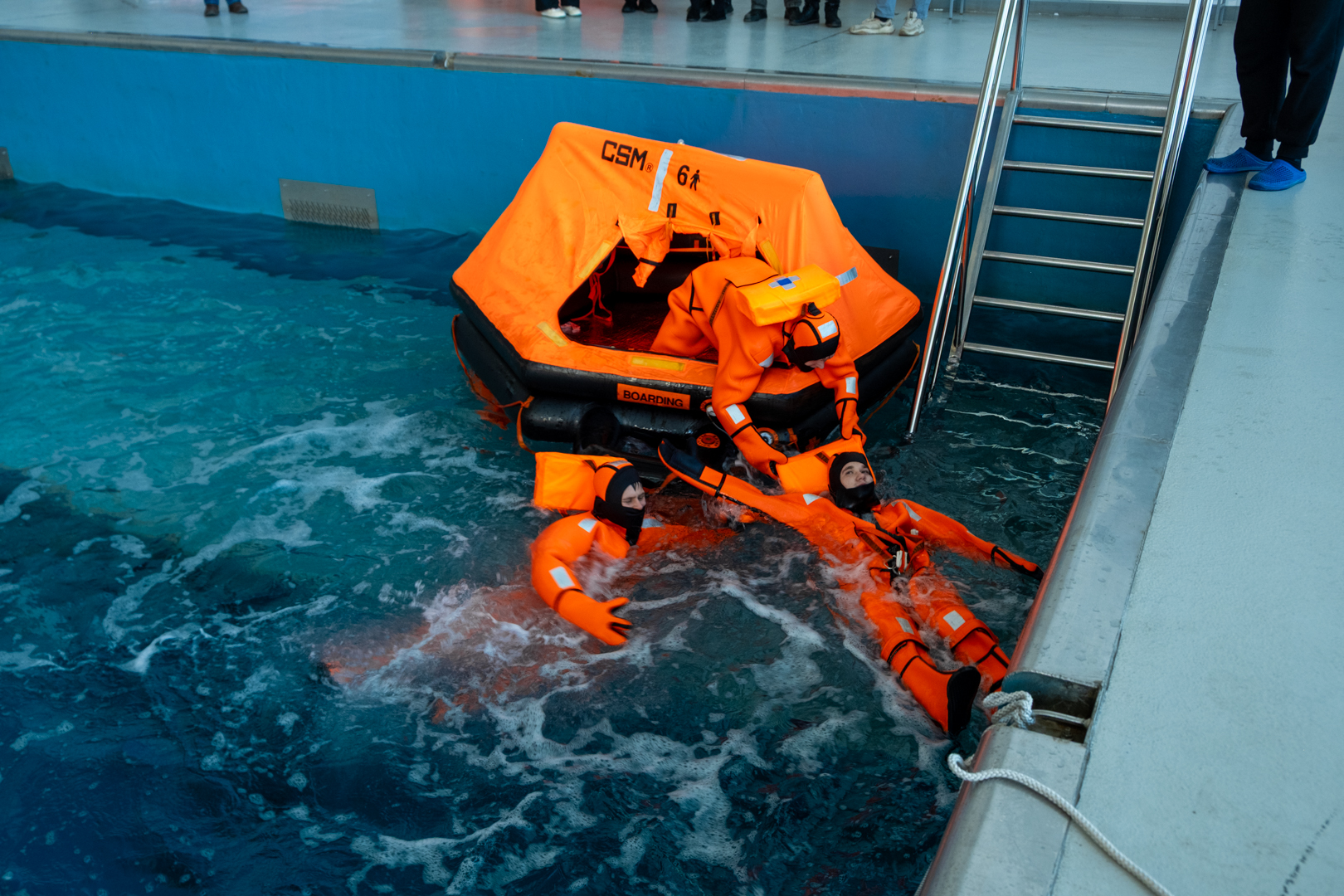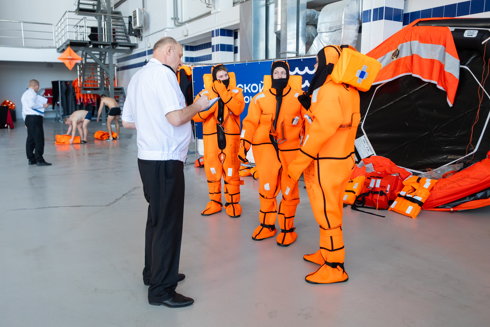 Отдельное внимание уделили борьбе за живучесть судна и спасению на море. Курсанты надевали спасательные жилеты и термогидрокостюмы на время, прыгали в бассейн, забирались в спасательный плот. По словам организаторов, с этой задачей справились все участники.