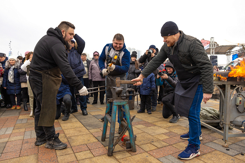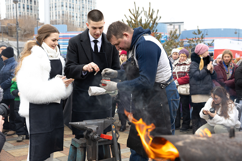 Гвоздём программы стала необычная «кузнечная свадьба». Супруги Матвей Назаренко и Юлия Сорока, накануне официально зарегистрировавшие брак, скрепили союз по древней традиции. Под руководством опытных мастеров они выковали гвоздь и оставили оттиск на памятной тарелке «Солнцеворот». В подарок молодая семья получила символический «семейный узел» и подкову на счастье.