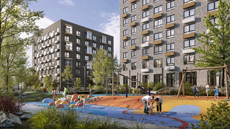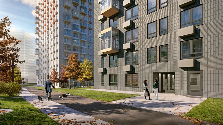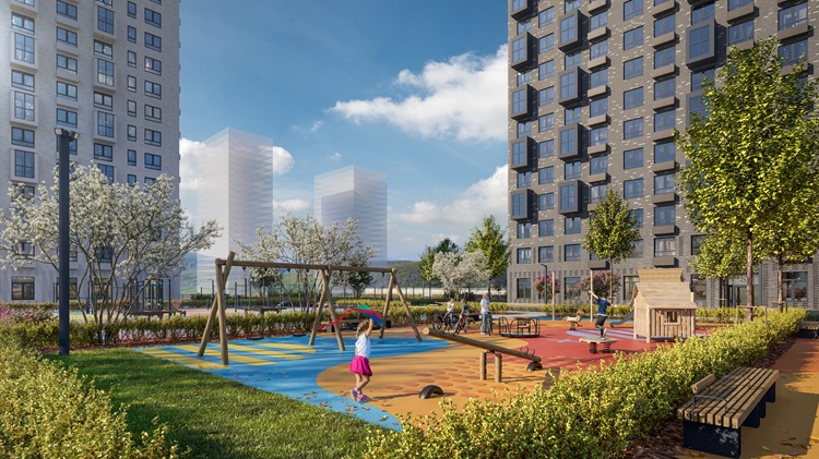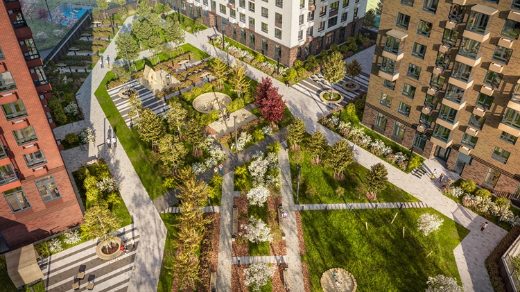 Квартал спроектирован с закрытыми дворами без машин, зелёными локациями для отдыха и спортивными, детскими площадками различного наполнения. На первых этажах предусмотрены магазины и сервисы.