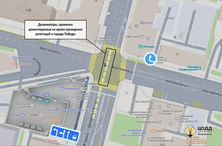 Водителям следует учитывать изменения при движении через перекресток. На Океанском проспекте действует знак «Направления движения по полосам», который разрешает поворот на Фонтанную только с двух крайних левых полос. Для маневра необходимо заблаговременно перестроиться в соответствующие полосы — это поможет избежать нарушений правил дорожного движения и аварийных ситуаций.