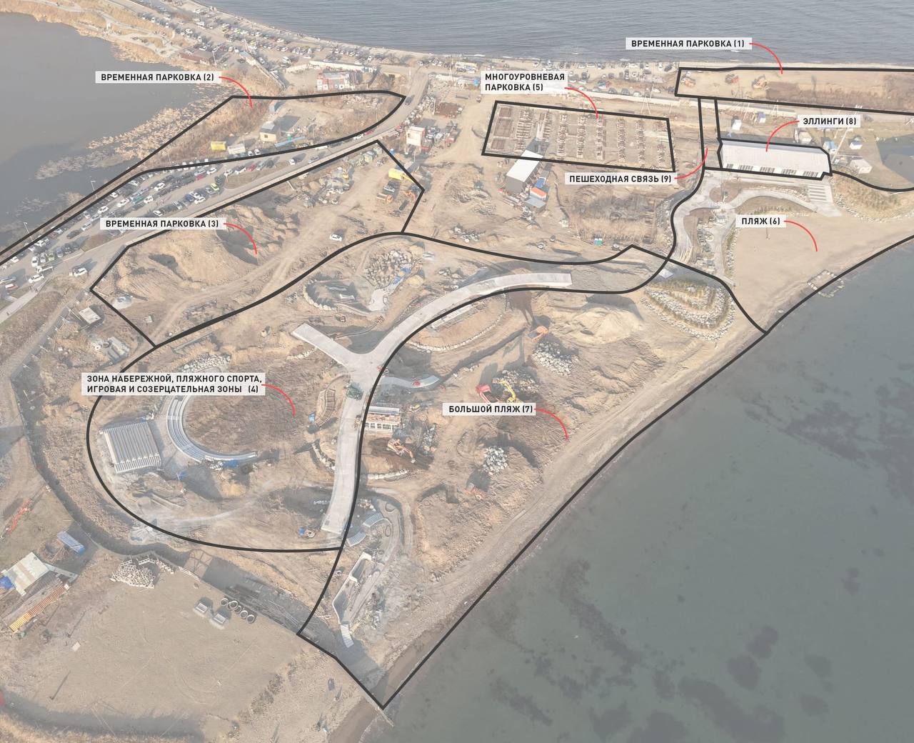 С 1 мая будут доступны временная парковка (1), удобный проход к воде вдоль эллингов (8), а также малый пляж (6), соединенный пешеходной связью (9).