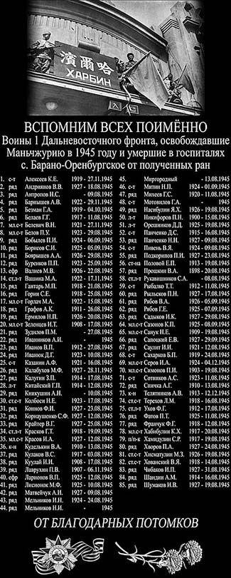 Недавно я выяснил, что мой прадед Симонов Петр Иванович умер в госпитале в Барано-Оренбургском в августе 1945 года и был похоронен там же. Какое-то время наша семья не могла найти никакой информации, кроме той, что он похоронен в индивидуальной могиле № 20 на западной окраине кладбища или села. И только несколько дней назад я обнаружил в Интернете статьи о том, что в последние годы в Пограничном районе Приморского края было установлено несколько памятников бойцам, погибшим в годы Великой Отечественной, и, в частности, статью, где сообщается об установке памятника непосредственно в Барано-Оренбургском. В статье есть список из 85 имен бойцов, и мой прадед значится в нем под номером 70.