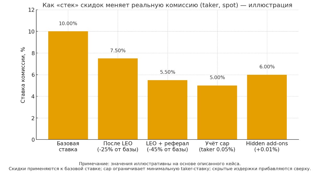 Полный стек: скидки к базе, минус caps — effective 0.02% = $10 на $50k. Здесь экономия ощутима ($25 vs $27.5 без стека), но hidden fees вылазят: на фьючерсах funding rate (0.01–0.05% в сутки) не скидывается LEO, и если позиция лонг/шорт держится неделю — это +$35 скрытых расходов. Маркетинг молчит, фокусируясь на "комиссиях".