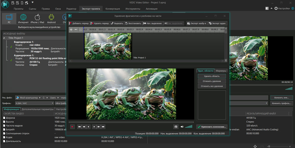 Бесплатный софт для профессионального монтажа. Предоставляет удобную функцию, с помощью которой можно маркерами разметить отдельные фрагменты и отрендерить их в отдельные файлы. Каждая такая часть будет сохранена с теми же параметрами разрешения и кодека, что и исходник.