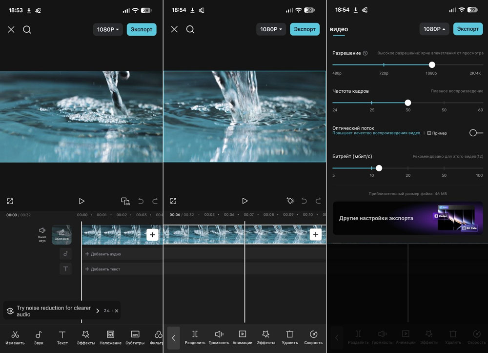 Тапните по изображению трех точек. Настройте разрешение и частоту кадров. Нажмите «Экспорт».