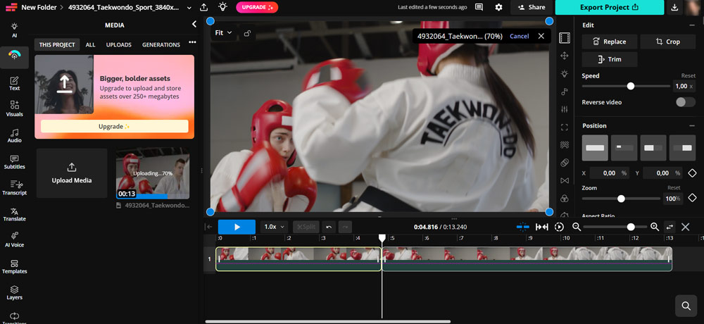 Сервис предоставляет множество ИИ-инструментов, однако является платным. В бесплатной версии экспортирует с вотермаркой, а максимальное разрешение — всего 720р. В остальном сайт стандартный: есть базовые инструменты, можно быстро разделить ролик на отдельные фрагменты.